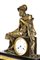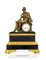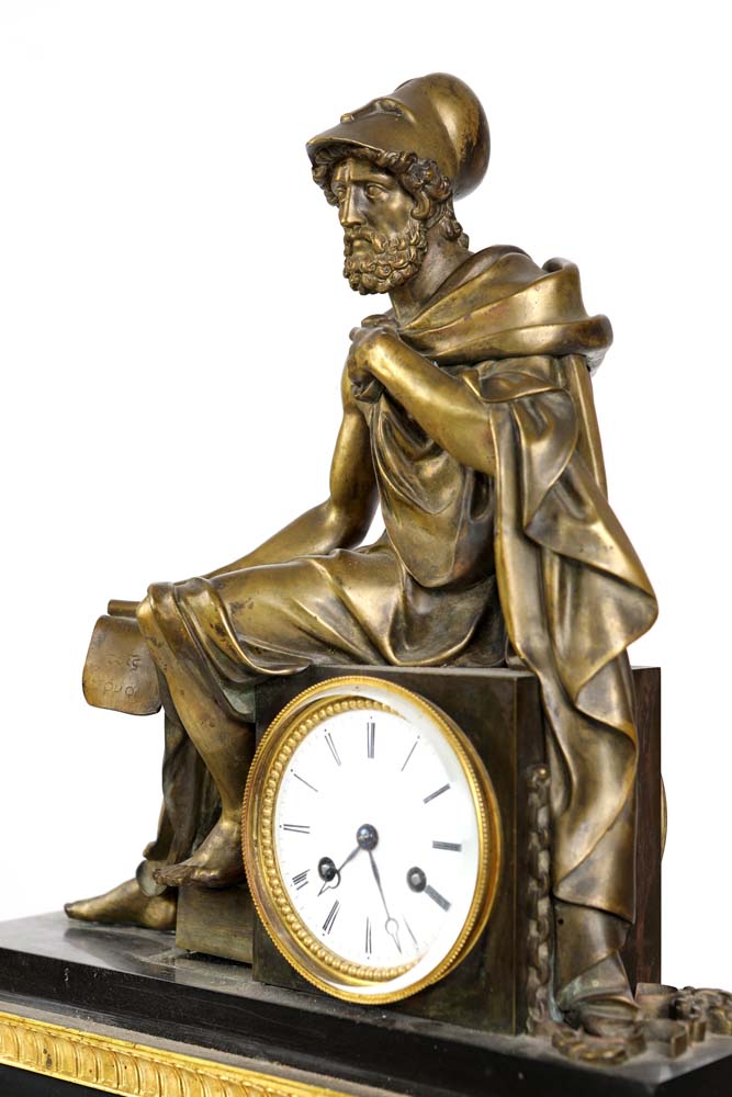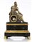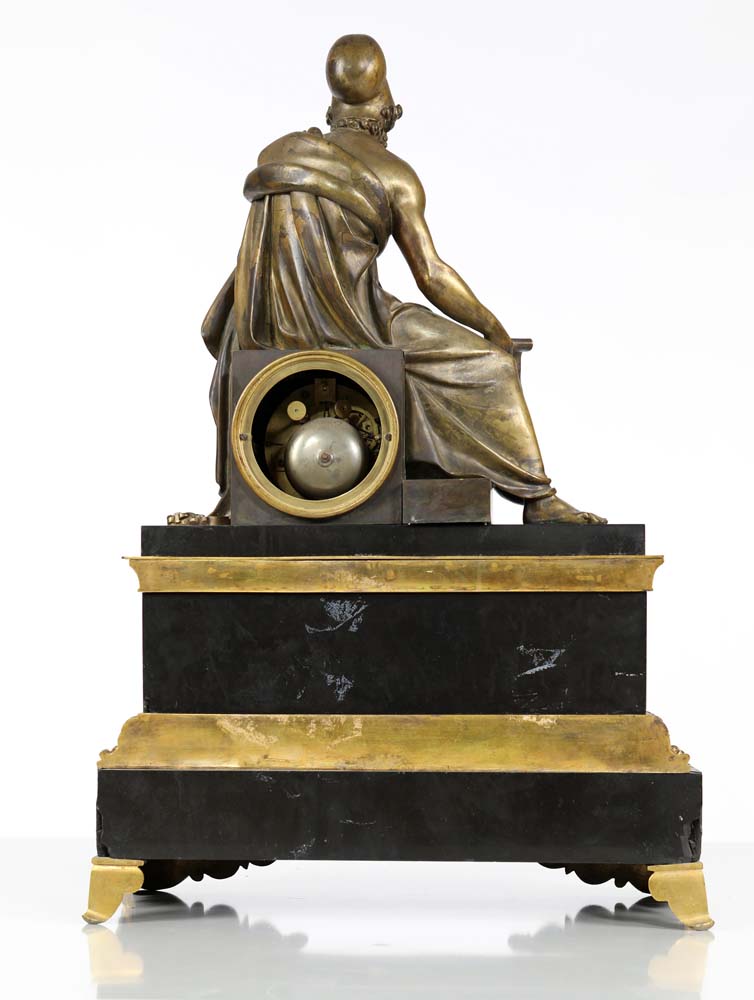 Grande pendola da camino Napoleone III in bronzo brunito e dorato cm 62x45x18 caratterizzata da figura virile seduta sulla cassa; quadrante circolare a due fori di carica con indicazione oraria a numeri romani, alto basamento rettangolare con profili cesellati e dorati; piedi a mensola