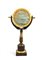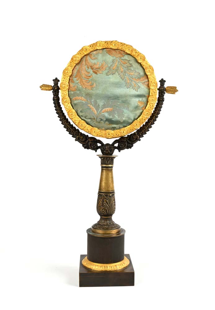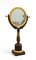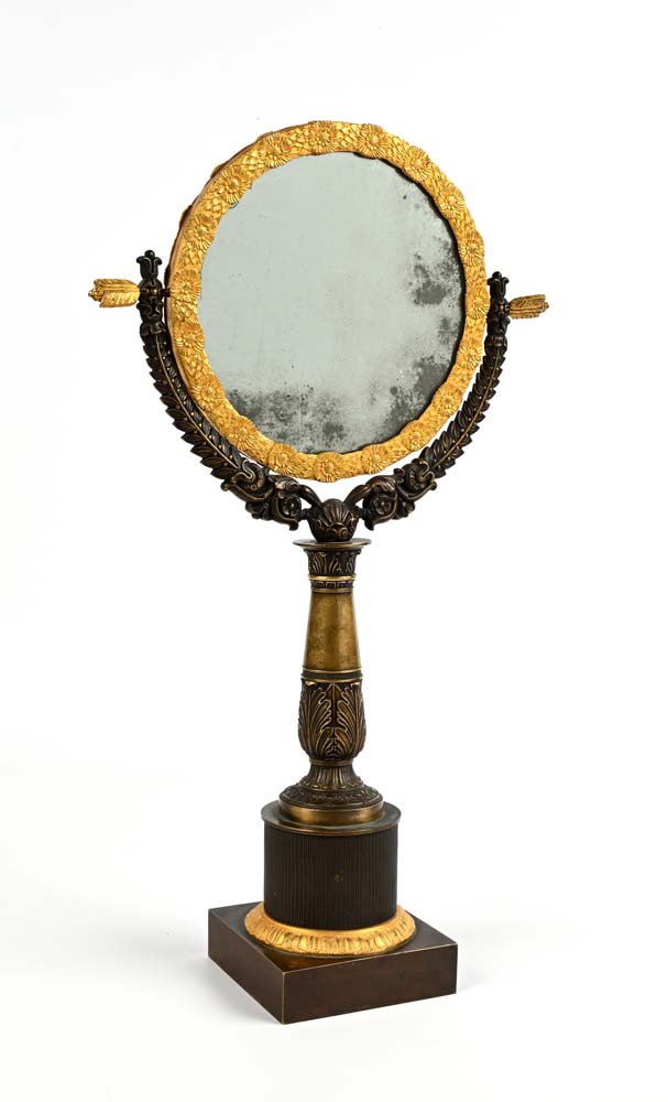 Psiche da tavolo in bronzo a doppia patina, Francia, Napoleone III cm 45x26x10 specchio circolare con cornice percorsa da corolle, trattenuto da un sostegno a forma di freccia che permette allo specchio di basculare nel semi arco posto sulla sommità di una colonna abbellita da foglie d'acanto; basso piedistallo cilindrico su base quadrangolare.