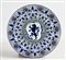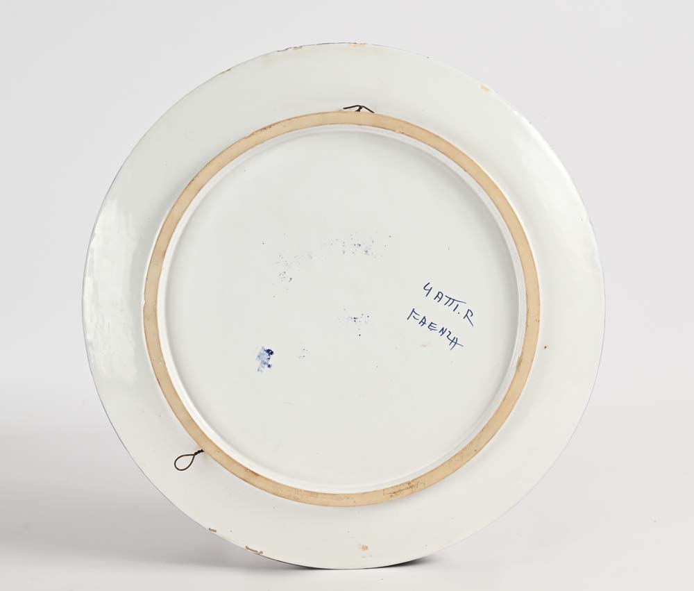 Piatto da pompa in maiolica bianca e blu, manifattura Riccardo Gatti, Faenza, XX secolo diametro cm 43 al centro leone rampante, stemma della città di Faenza; tutt'intorno si dispongono a cornice "Palmette Persiane", motivo tradizionale della ceramica faentina. Firmato al verso "R. Gatti Faenza"