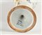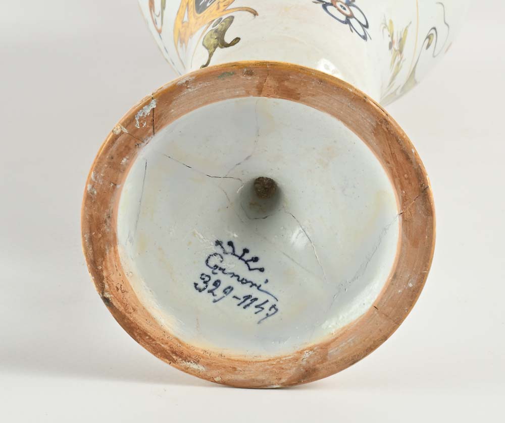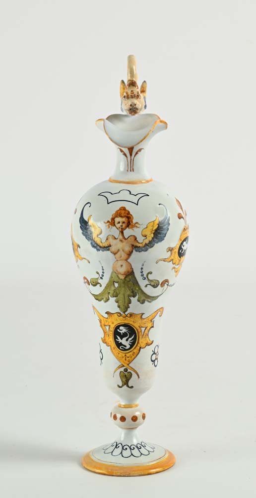 Versatoio in maiolica, manifattura Ginori di Doccia altezza cm 36 con decorazione a raffaellesche ed ansa a forma di drago. Iscritto Ginori 329-1147. Restauri