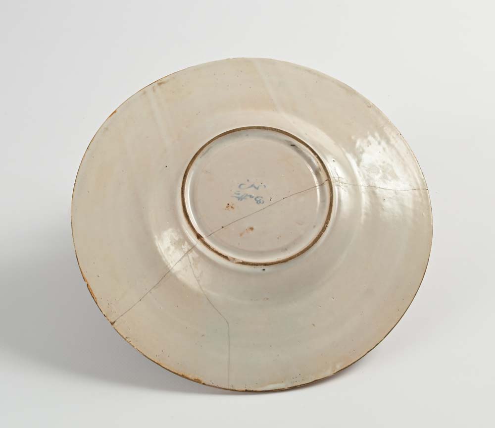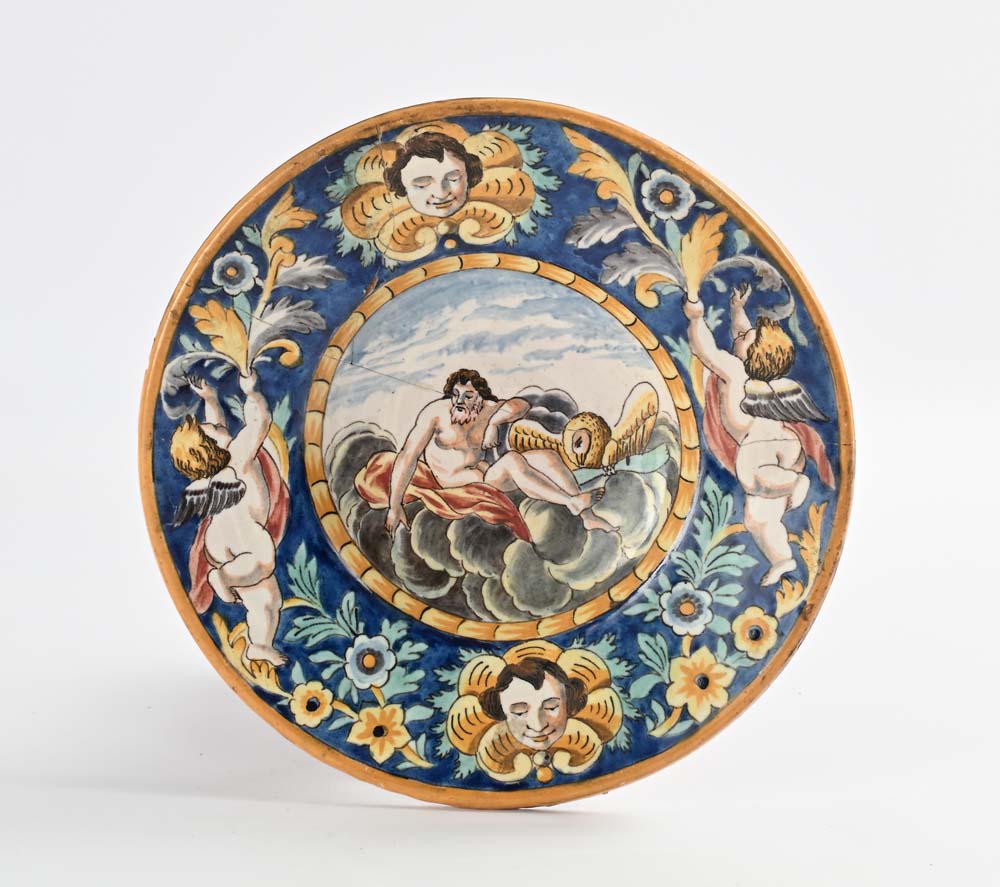 Piatto fondo in maiolica policroma, XX secolo diametro cm 25 decorato nel cavetto da figura di Giove con aquila; lungo la tesa teste di cherubino e motivi floreali. Difetti