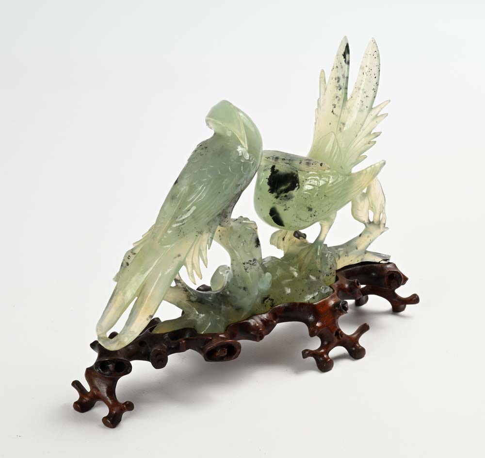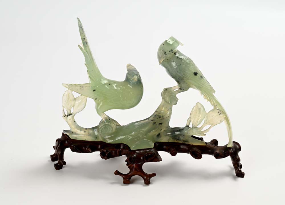 Intaglio in giada raff. due uccelli su un ramo, base in legno cm 14,5x21x7 - con la base cm 18x23x10