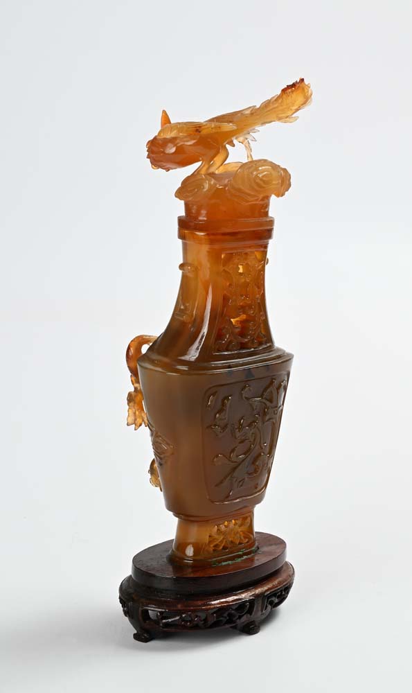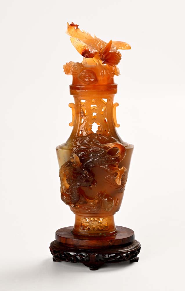 Incensiere in agata gialla con drago in altorilievo e gallo sul coperchio,...