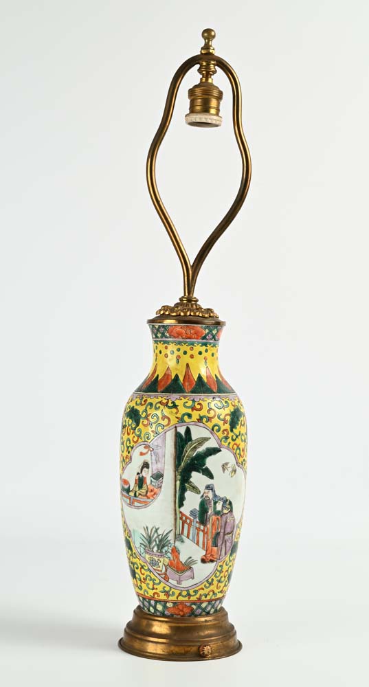 Vaso in porcellana policroma, Cina, fine dinastia Qing altezza cm 65 trasformato a lampada da tavolo