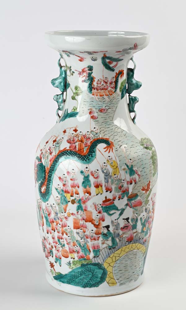 Vaso a balaustro in porcellana policroma, Cina, XX secolo altezza cm 45 decorato in policromia con figure di orientali; anse plastiche in forma di drago