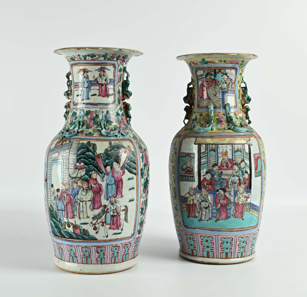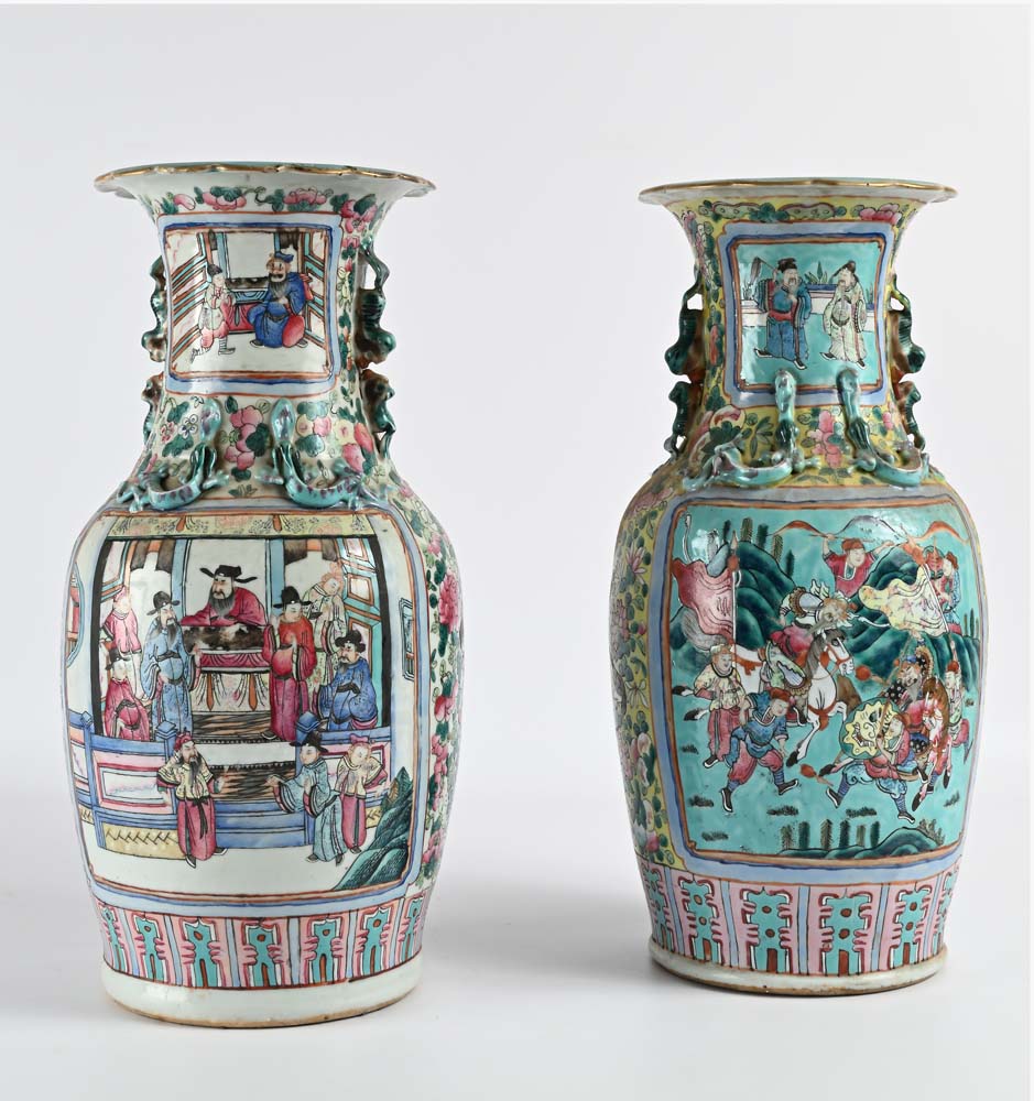 Due vasi in porcellana policroma, Cina, fine dinastia Qing altezza cm 45,5 dalle analoghe caratteristiche decorative