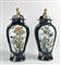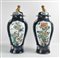 Coppia di grandi potiches in porcellana, Giappone, XIX secolo altezza cm 74 decorate da alberi in fiore e figure di volatile entro riserve su fondo blu; coperchi a cupolino sormontati da presa scultorea dorata in forma di cane di Pho