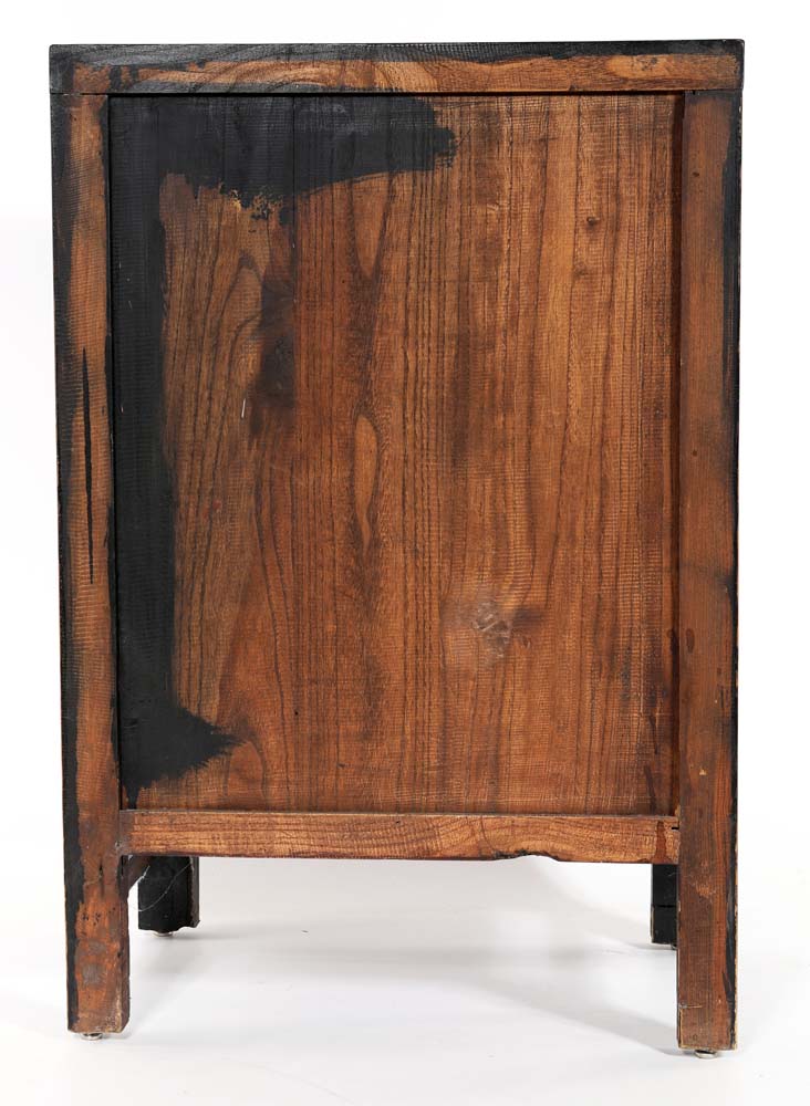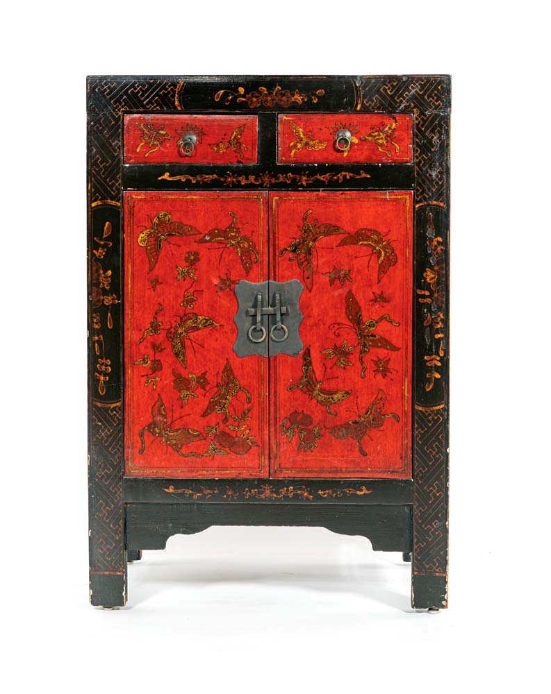 Mobiletto in legno laccato rosso e nero con farfalle, Cina, XX secolo cm 86x58x38 due tiretti e due sportelli frontali, piedi squadrati