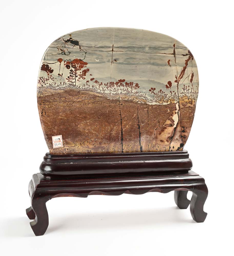 Schermo in pietra paesina su base in legno, Cina, XX secolo cm 33,5x44 - con la base cm 51x46x12