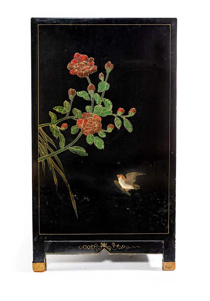 Credenza in legno laccato nero con motivi decorativi applicati, Cina, XX secolo cm 81,5x117,5x46,5 piano e fianchi decorati da rami fioriti e figure di volatile; facciata scandita da due cassetti allineati, due sportelli centrali sottostanti delimitati da ante laterali, decorati da motivi figurati in rilievo