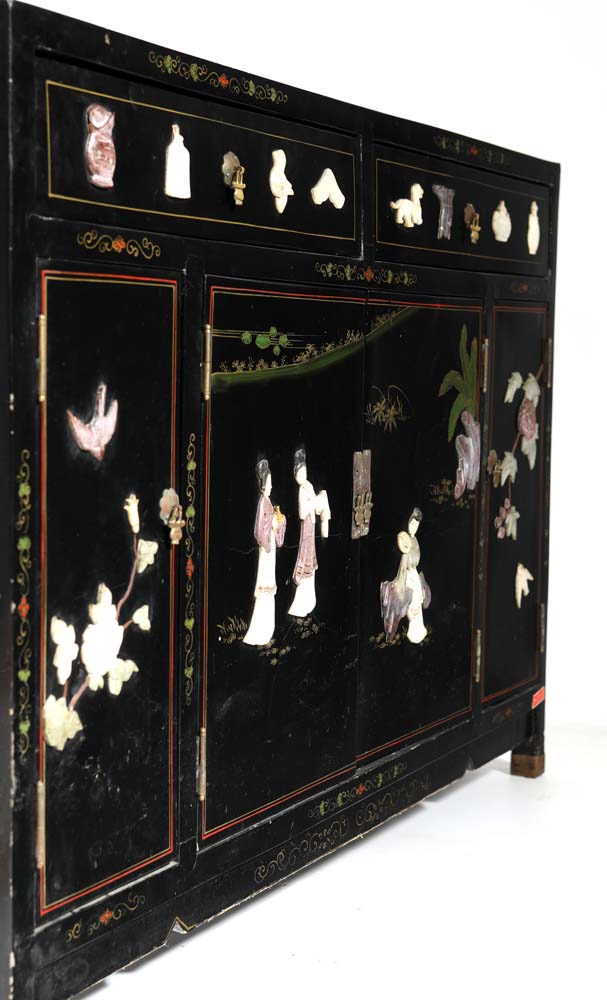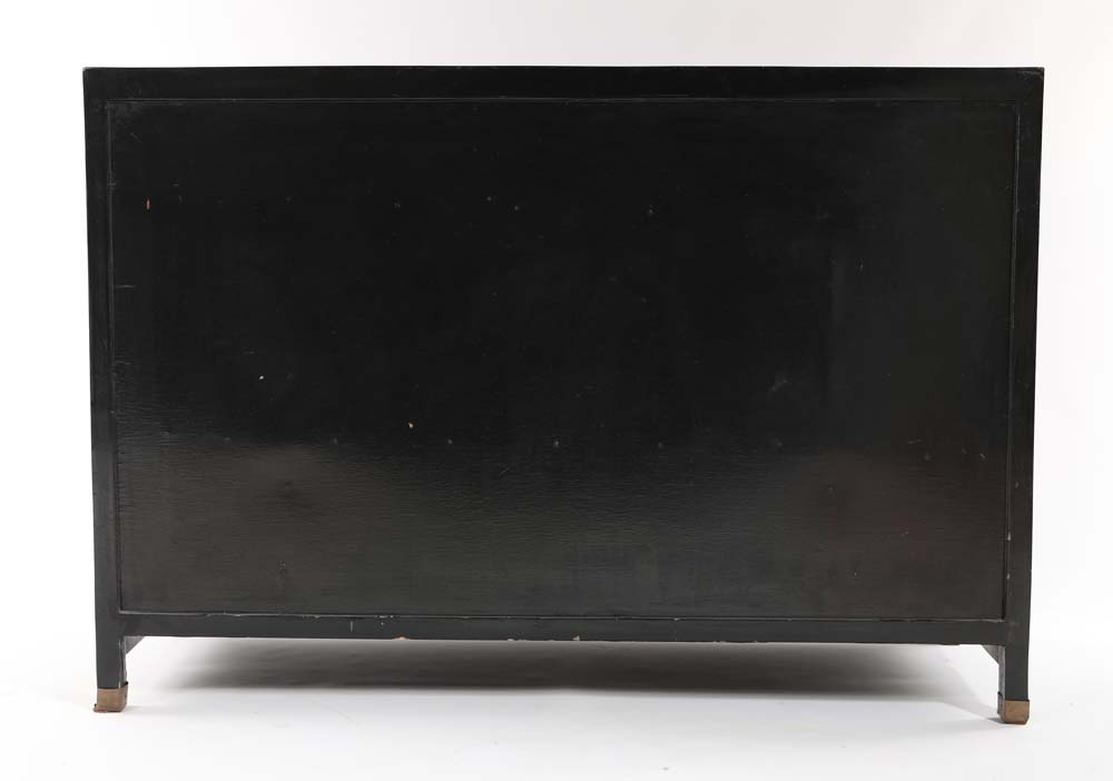Lotto 246 | Credenza in legno laccato nero con motivi decorativi applicati, Cina, XX...