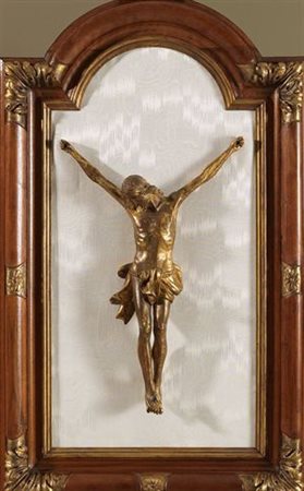 CROCIFISSO Crocifisso in legno dorato con cornice coeva, epoca metà XVIII secolo H 45 cm