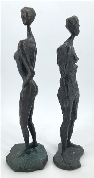 Due sculture in bronzo raffiguranti rispettivamente figura femminile e maschile, di altezze diverse
