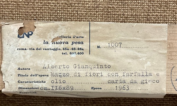 Alberto Gianquinto "Mazzo di fiori con farfalla e carta da gioco" 1963-64 olio s