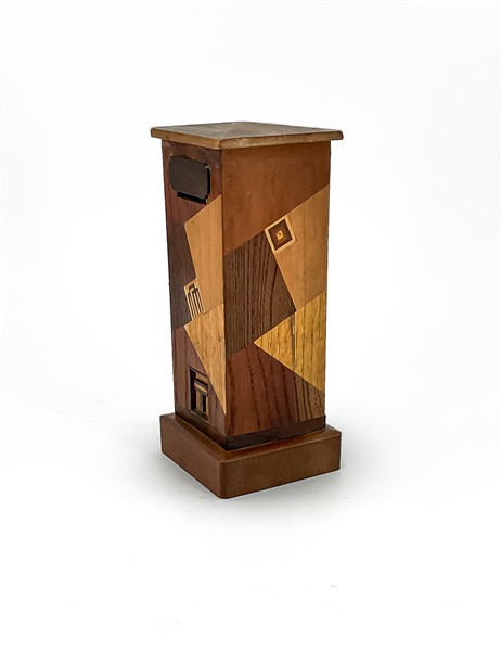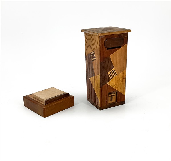 Salvadanaio in legno di varie essenze. Giappone, periodo Meiji (1868-1912) (cm 18x7) (difetti)