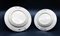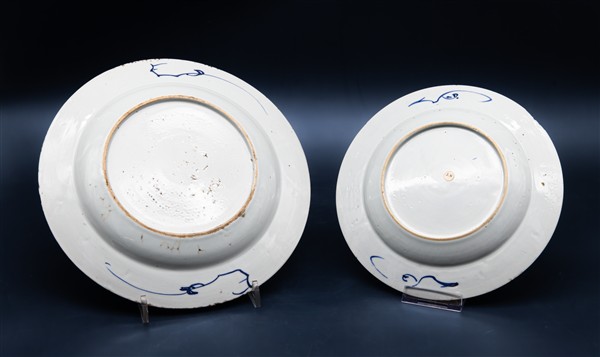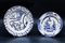Duie piatti in porcellana bianca e blu con decoro floreale e a pagode.