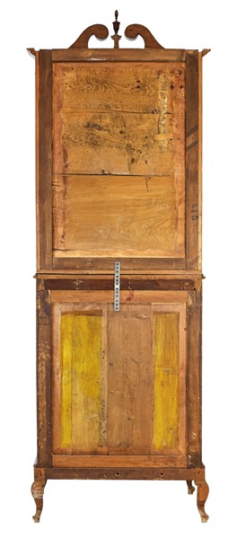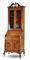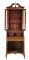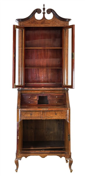 Piccolo trumeau impiallacciato e filettato in legni vari, parte inferiore a due sportelli, due cassetti e calatoia celante quattro tiretti e vano a giorno. Parte superiore a due sportelli con vetro e cimasa a volute contrapposte con pinnacolo (cm 71x209x48) (difetti)