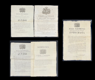 GRIDA. Provincia della Lomellina. Collezione di cinque grida datate dal 1819 al 1830 di diverso argomento. Tra queste si segnala una relativa all'obbligo di licenza per alberghi e osterie per poter continuare ad esercitare la loro attività (difetti e mancanze)