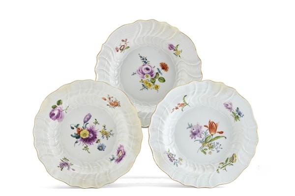 Manifattura di Meissen, secolo XVIII-XIX. Tre fondine in porcellana a profilo mistilineo decorate da mazzi di fiori policromi, tesa a rilievo a finto vimini. Marcate sotto la base (d cm 22) (difetti e restauri)