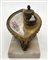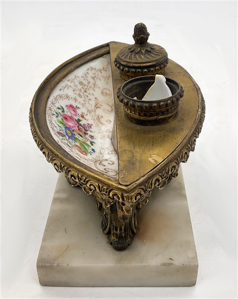 Manifattura francese del secolo XIX. Calamaio con vasca in porcellana decorata in policromia a fiori nel cavetto e volute dorate, ghiera e base in bronzo dorato decorate a elementi concatenati e animali fantastici, plinto in marmo bianco (cm 13x15x9) (gravi difetti e mancanze)