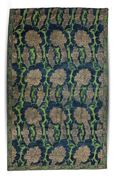 Manifattura di Mariano Fortuny, Venezia, inizio secolo XX. Tessuto da parati in cotone stampato a riserva mediante colla di coniglio e polvere d'argento con decoro ispirato ai velluti rinascimentali italiani. Il motivo a meandro incrociato è composto da steli con fiori di cardo all'apice in argento su fondo blu reale e volute stilizzate in verde mela (cm 190x120) (lievi difetti)