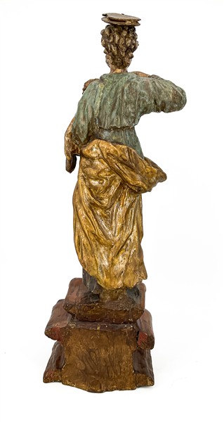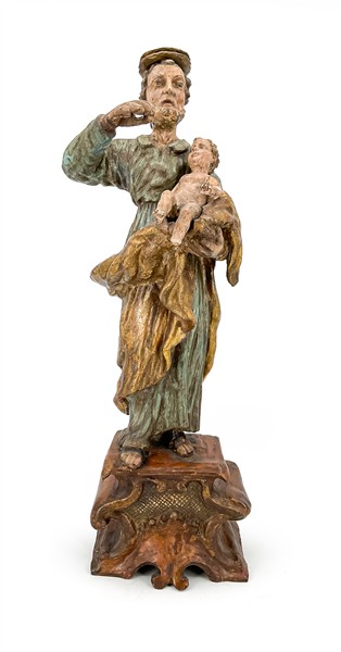 Scultura raffigurante San Giuseppe col Bambino in legno intagliato, laccato in policromia e dorato su base sagomata (h cm 62) (difetti e restauri)