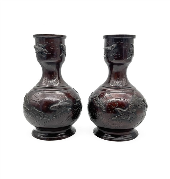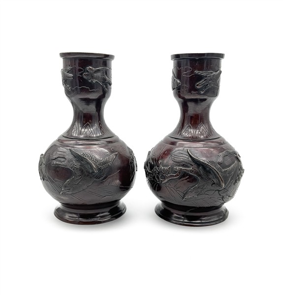 Coppia di vasi a bottiglia in bronzo inciso con decoro a volatili a rilievo. Gi