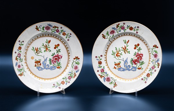 Manifattura di Milano, 1770-1780. Coppia di piatti in maiolica dipinta in policromia decorati nello stile della coeva porcellana cinese di importazione a porpore della ''Famiglia Rosa'', con l'orlo ornato ''a punta di lancia'' in oro (d cm 23) (difetti)