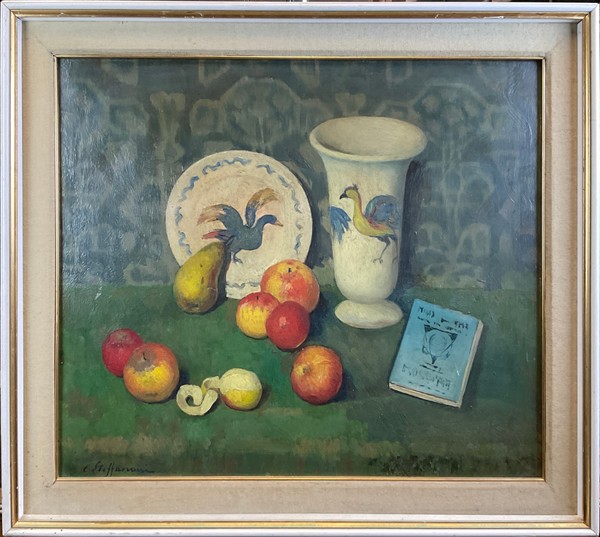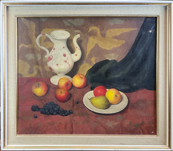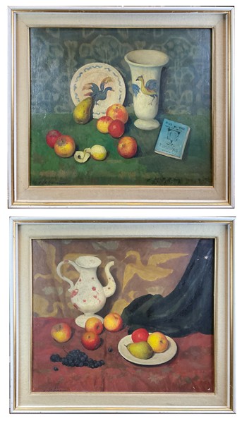 Cesare Steffanoni Coppia di "Nature morte con frutta e vasellame" oli su compens
