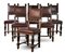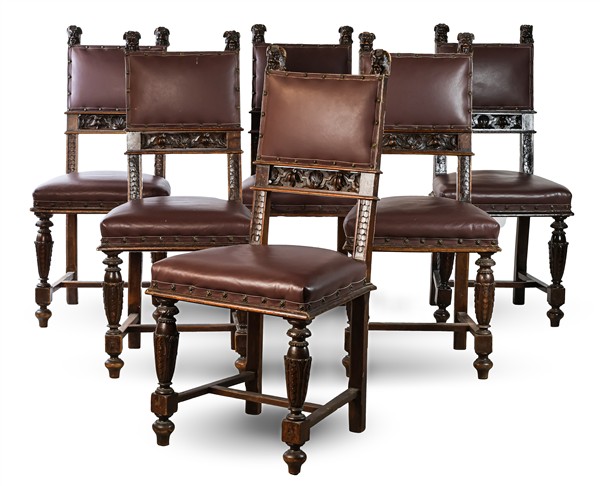 Gruppo di sei sedie neorinascimentali in legno tinto e intagliato con mascheroni, cartella centrale decorata da valva di conchiglia e volute fogliate, gambe anteriori tornite, seduta e schienale con rivestimento in pelle (difetti)