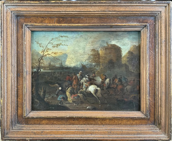 Scuola del Nord Europa del secolo XVIII "Battaglia contro i turchi" olio su ta