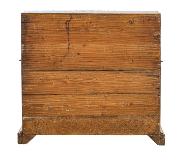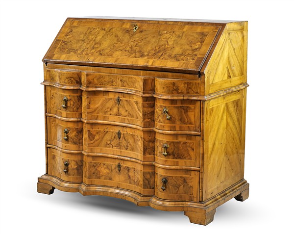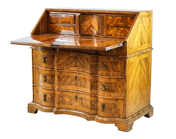 Ribalta lastronata in noce e radica di noce con filettature, fronte mosso a tre cassetti e calatoia celante quattro tiretti, antina convessa e pianetto scorrevole con segreti. Veneto, secolo XVIII (cm 116x107x60) (difetti)