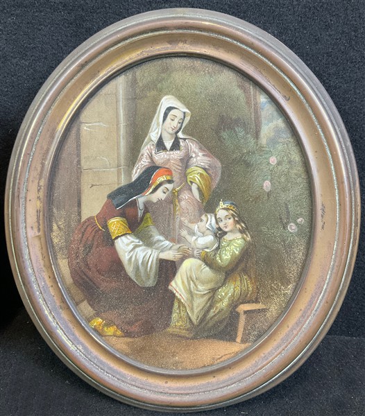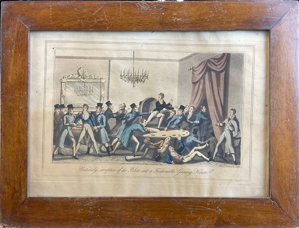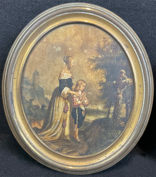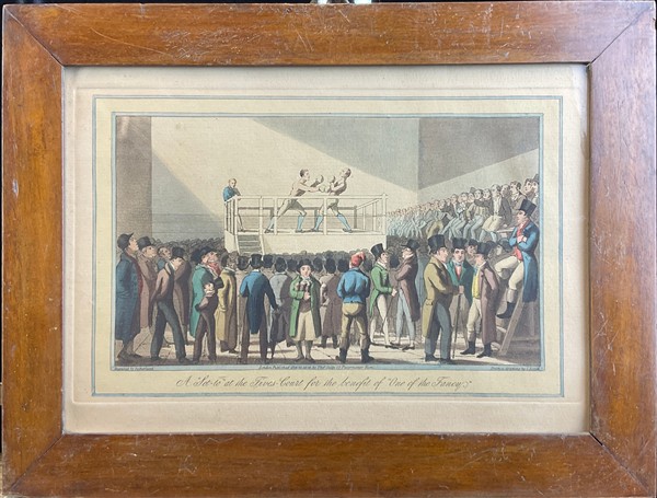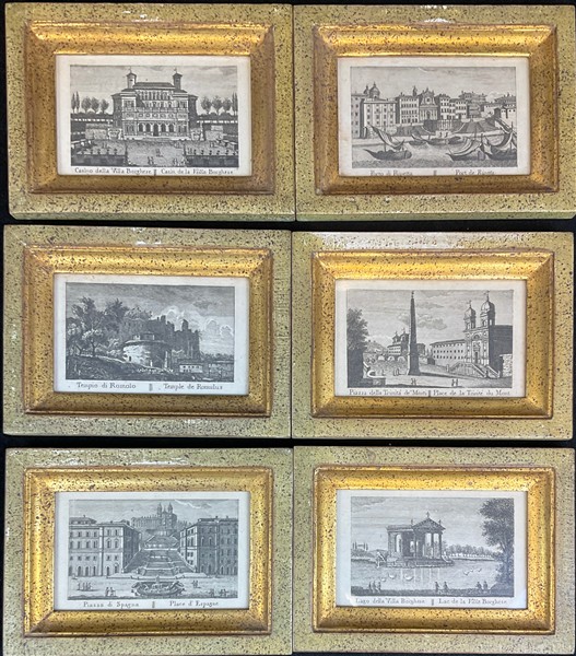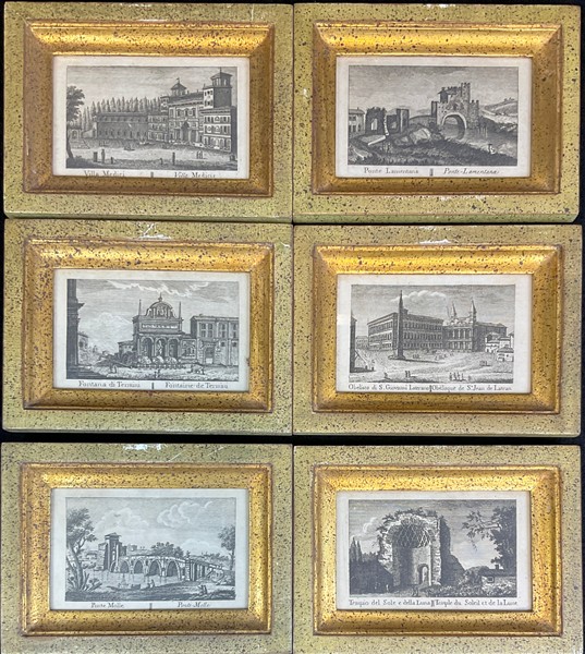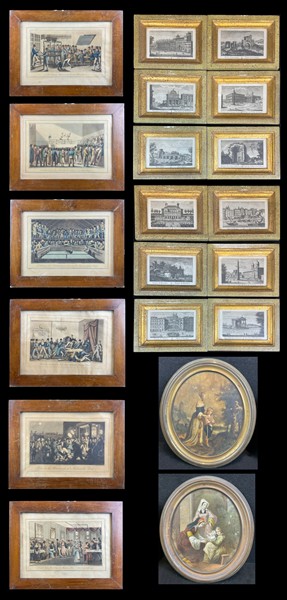 Cartone contenente numerose incisioni e stampe antiche fra cui alcune vedute di paesaggi romani e scene di genere in cornici. Secolo XIX (difetti)
