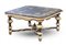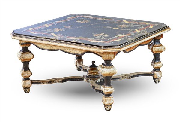 Tavolo da salotto con piano in marmo dipinto in policromia a nastri, fiori e fa