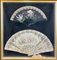 Lotto di due ventagli di cui uno con stecche in madreperla e pagina in pizzo ricamato e carta dipinta con scena galante, l'altro con stecche in bachelite e pagina in pizzo e tessuto dipinto con decoro floreale firmato Gisa. Entro teca (cm tot 63x63) (difetti)