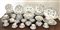 Parte di servizio da tavola in porcellana bianca e blu composta da sei piatti piani, sei fondi, sei piatti medi, sei piattini, zuppiera con coperchio, tre piatti da portata diversi, sei tazze da caffè con piattino, sei tazze da brodo con coperchio e piattino, una salsiera, una ciotola e altri diversi piattini e tazze. (difetti)