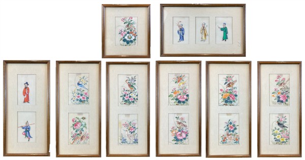 Lotto di otto pannelli con disegni su carta di riso con soggetti diversi. Cina,