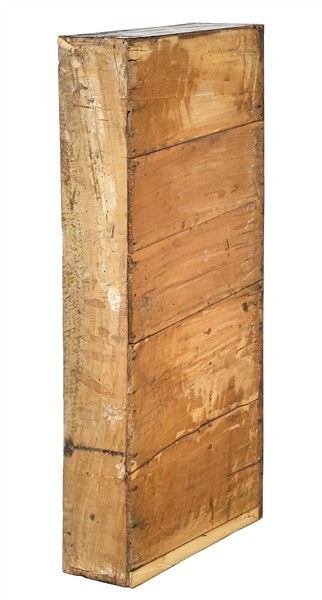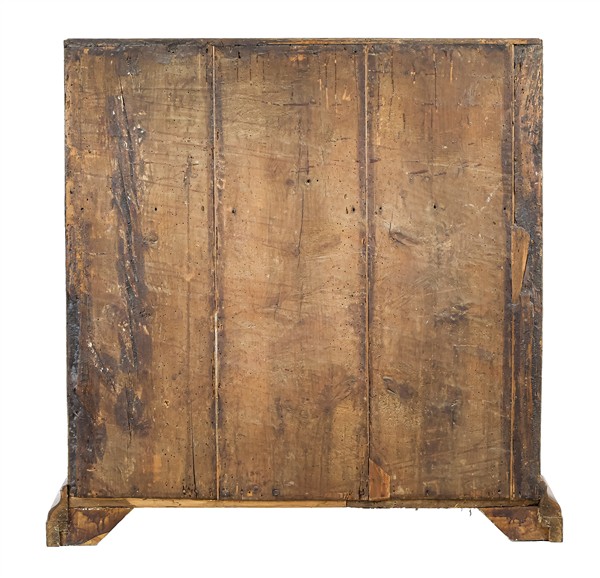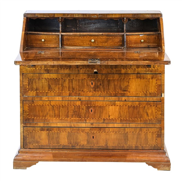 Ribalta lastronata in noce e filettata in legni vari, fronte a tre cassetti e c
