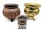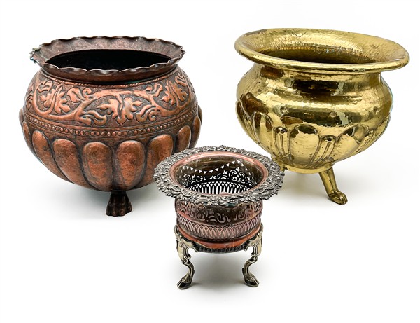 Lotto composto da due diversi cachepot in rame e rame ottonato e un'alzata in metallo argenato e traforato (h max cm 30) (difetti)