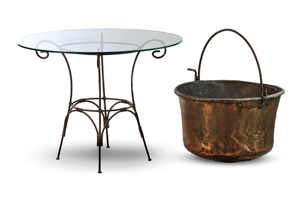 Lotto composto da un tavolo circolare con struttura in ferro battuto verniciato e piano in vetro (h cm 76, d cm 100), unito ad un grande paiolo in rame (h cm 44; d cm 70) (difetti)