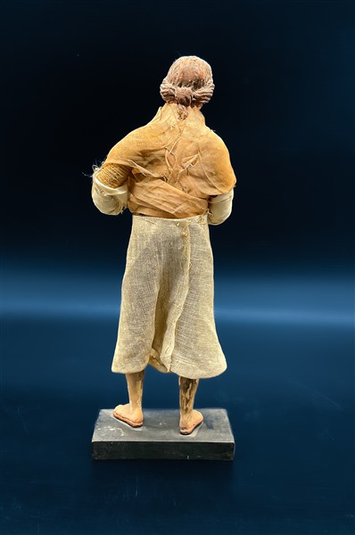 Arte napoletana, secolo XIX. Figura di popolana in terracotta policroma con parti in lino e altri materiali, occhi in pasta vitrea (h cm 28,5) su base rettangolare (difetti)