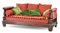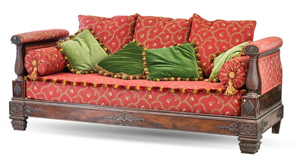 Divano impiallacciato in mogano e decorato a fregi con palmette, montanti a balaustro scanalato. Secolo XIX. Seduta imbottita e schienale formato da cuscini in tessuto operato rosso (l cm 215) (difetti)