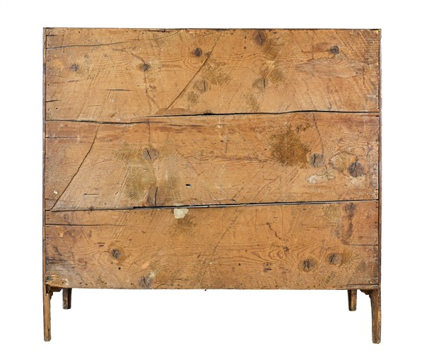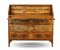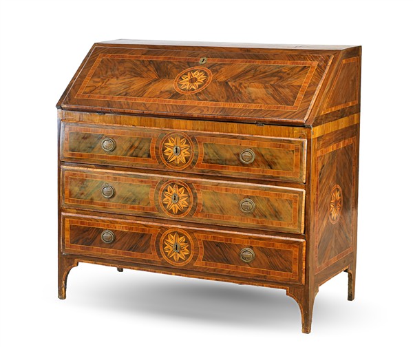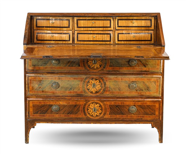 Ribalta lastronata in palissandro e legni di differenti essenze, decorata da filettature e intarsi a rosoni. Fronte a tre cassetti e calatoia celante sei tiretti, piedi a mensola. Fine secolo XVIII (cm 114x107x53) (difetti e piccole mancanze)