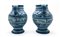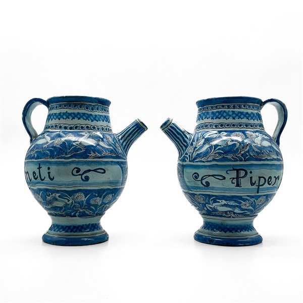 Manifattura del secolo XVIII. Coppia di orcioli in maiolica decorata in monocromia blu a figure di animali e fiori, con iscrizione del contenuto entro cartiglio (h cm 23) (difetti)