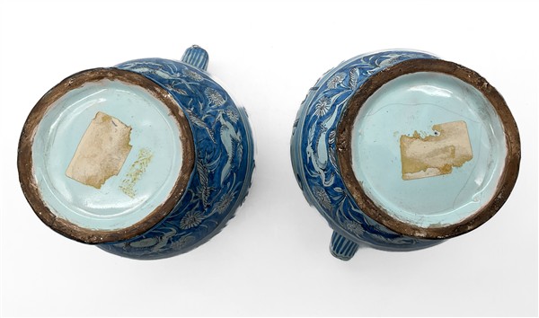 Manifattura del secolo XVIII. Coppia di orcioli in maiolica decorata in monocro