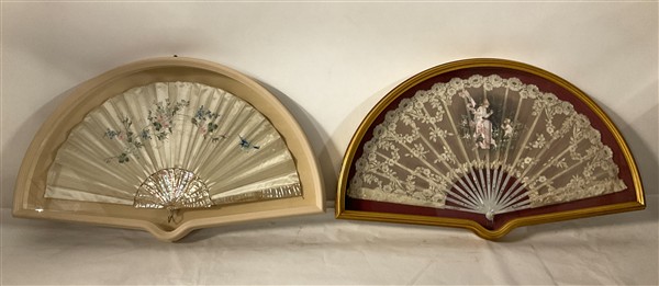 Due ventagli con stecche in madreperla e pagina dipinta a figure e fiori (cm max 65x35), inizio secolo XX. In teche moderne (difetti)