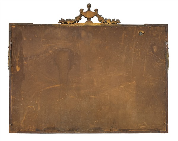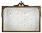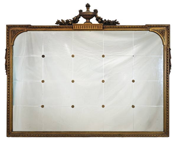 Caminiera in legno dorato con cimasa intagliata a vaso fiammato e festoni fioriti, specchio riquadrato (cm 147x121) (difetti)