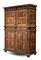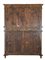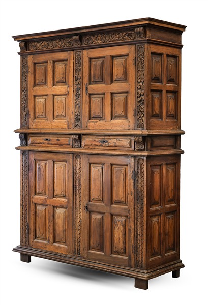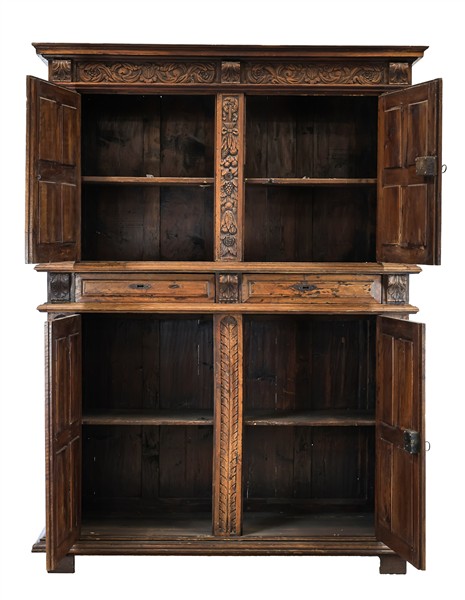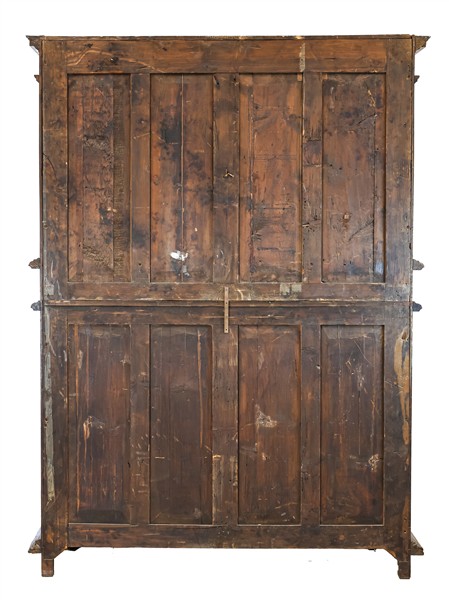 Mobile a due corpi in legni vari con quattro ante riquadrate e pannellate e due cassetti, fasce e lesene intagliate a volute, foglie e festoni di frutti. Secolo XIX (cm 157x215x56) (difetti e restauri)