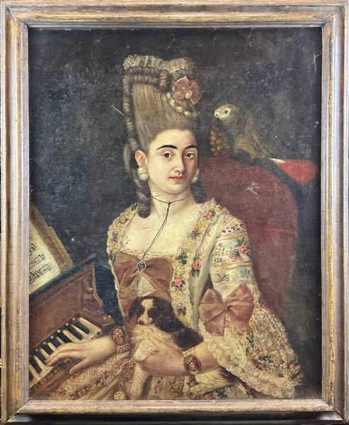 Scuola del secolo XVIII "Ritratto di dama alla spinetta con cagnolino e medagl