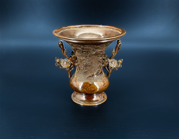 Piccolo vaso biansato in bronzo con figure in un cartiglio ed anse in forma di rami fogliati. Giappone, secolo XX (h. cm 14) (difetti)
